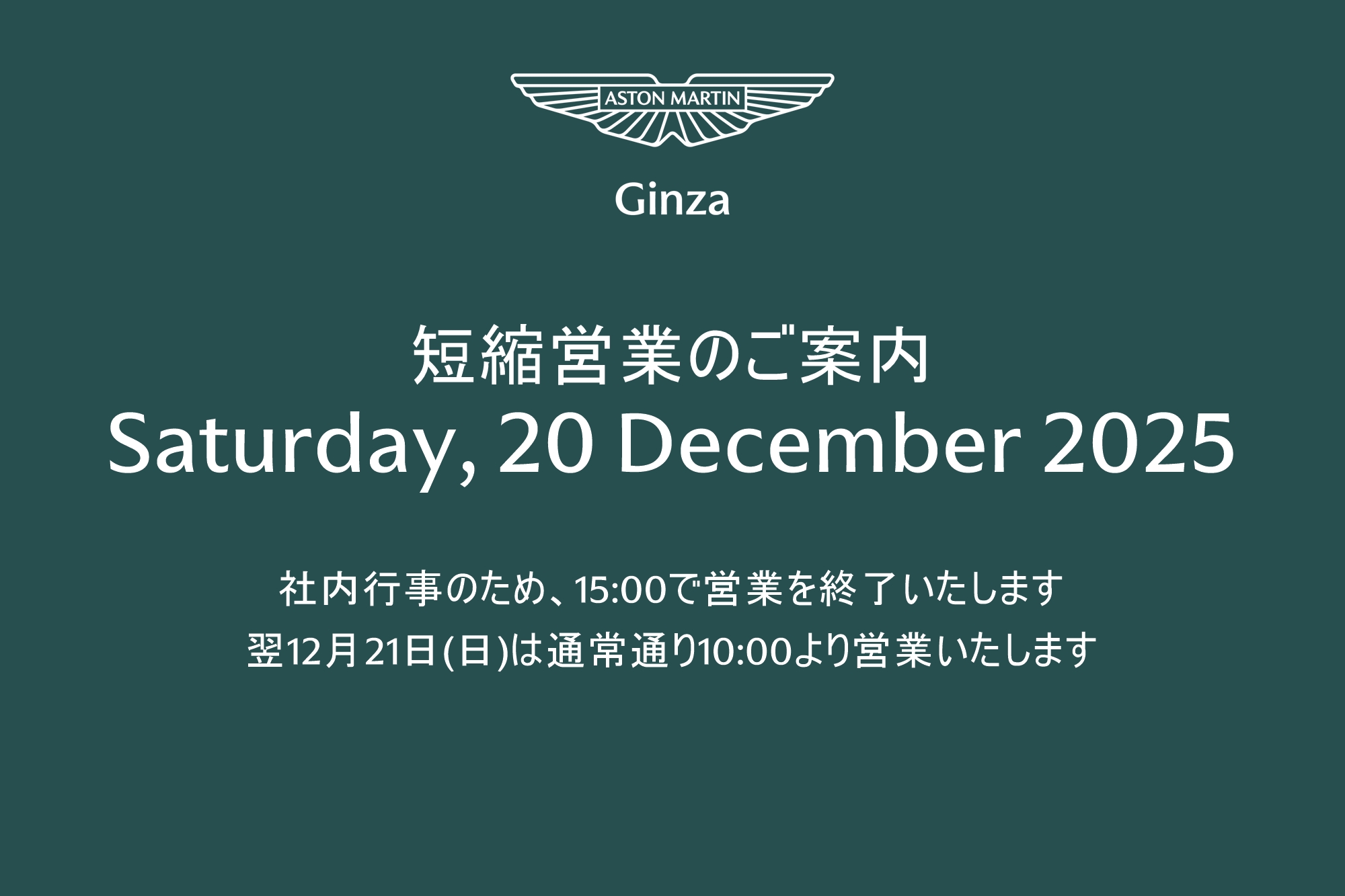 いつもアストンマーティン銀座のHPをご覧いただきありがとうございます。 誠に勝手ではございますが、社内行事のため、 2025年12月20…